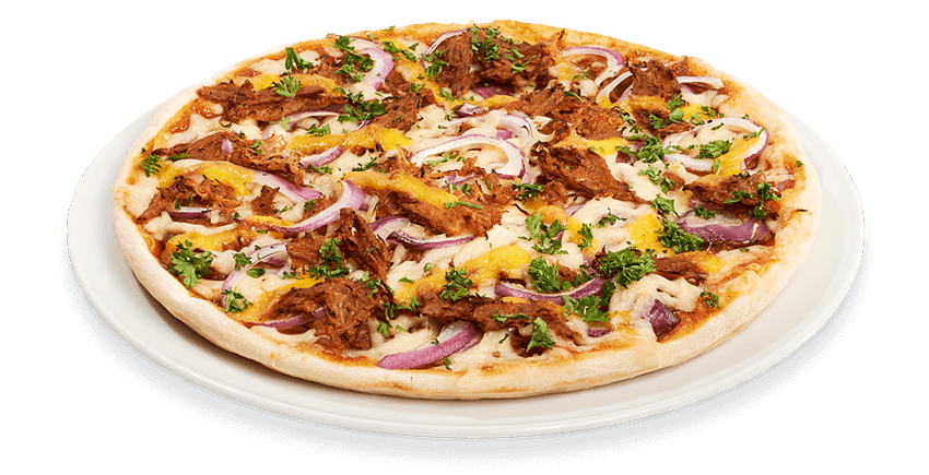 mit Pizzasoße, Hähnchenbrust, feurigen Jalapeños, Freddys Gouda-Mozzarella-Mix, Cheddar-Käse und Mozzarella
